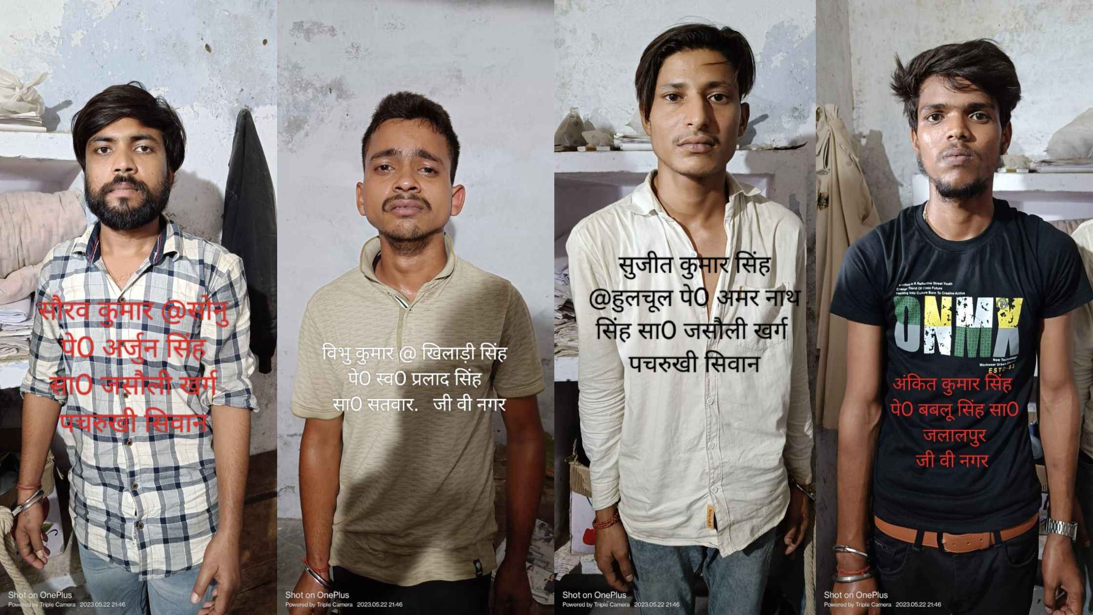 जी.बी. नगर थाना क्षेत्र के सतवार गांव स्थित बिभु कुमार सिंह उर्फ खेलाड़ी सिंह के घर से सोमवार की रात अपराध की योजना बनाते थानाध्यक्ष अखिलेश कुमार के नेतृत्व में गठित छापेंमारी दल ने एक देसी कट्टा, एक पिस्टल, चाकू, पांच जिंदा कारतूस और मोटरसाइकिल के साथ चार बदमाशों को गिरफ्तार कर लिया गया। गिरफ्तार बदमाशों की पहचान पचरुखी थाना क्षेत्र के जसौली निवासी सुजीत कुमार उर्फ हुलचुल,सौरभ कुमार,जीबी नगर थाना क्षेत्र के सतवार निवासी बिभु कुमार सिंह उर्फ खेलाड़ी सिंह तथा जलालपुर निवासी अंकित सिंह के रूप में कई गई है।